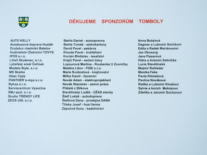 Velké poděkování patří všem organizátorům této akce, která je vždy plná tance a dobré nálady. Paní Zdeňce Sochorové, která po celý večer hospodařila v kuchyňce a pomáhala spolu s dcerou Vendulou s přípravou tomboly. Paní Jarošové za trpělivé namotání výherních i nevýherních lístků. Za zajištění tomboly a výzdobu sálu děkujeme naší paní starostce. Za obsluhu baru Adamu Novákovi, Ondřeji Blažkovi a Vendule Sochorové, Za prodej lístků a výdej tomboly Marii Fatrdlová, Vendule Sochorové, Danieli a Jakubovi Sochorovi. Obecní ples se opravdu vydařil, všichni si užili čas strávený s přáteli a protančili celou noc.